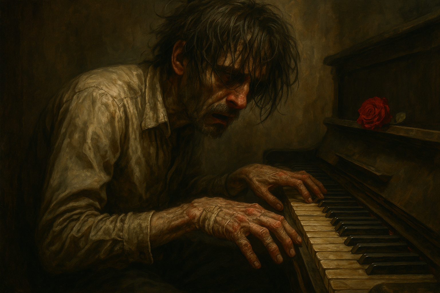 En el banco del piano —el viejo piano polvoriento que no había tocado en años— reposaba una solitaria rosa roja. La misma que su madre solía dejar en su puerta cuando era niño, cada vez que fallaba.